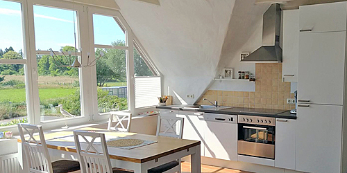 In der intergrierten Küchenzeile finden Sie eine Spülmaschine, Ceran-Kochfeld und Umluftbackofen. Der Blick aus dem Erkerfenster am Essplatz macht jede Mahlzeit zum Naturerlebnis.