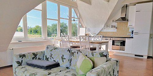 Die sichtbaren Deckenbalken prägen den großen Wohn- und Essbereich und geben den Blick bis in den Giebel frei. Die Treppe im Wohnraum führt auf eine 20 qm große Gallerie. Großzügige und helle Möbel mit scandinavischem Flair bieten Ihnen besten Komfort.